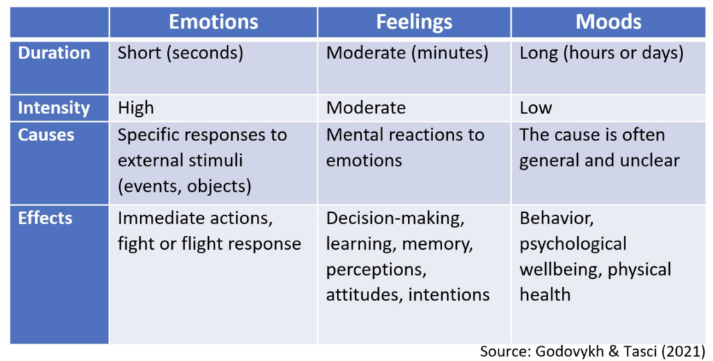 Emotion and feeling aren’t strictly synonymous terms, and mood showcases long-term feeling states, as Frank Ninivaggi describes [see next section]. Each term conveys subtle distinctions depending on how long it lasts and the role of cognition.