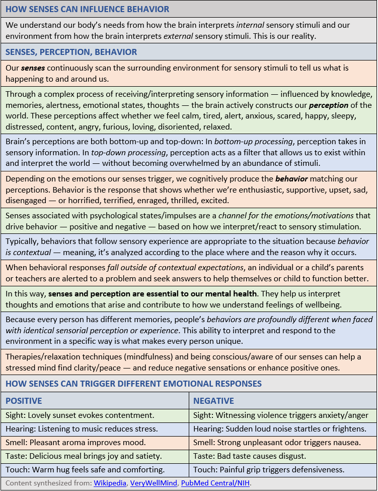 In Post 7: A Synthesis: Sensory Systems and our Emotions—Part II, I’ll continue exploring emotion sensation (also called sensory emotional processing). Though scientists approach the topic differently, they agree senses and emotions are separate but intertwined. More research is needed to understand how we, the people, function —sensorily, emotionally, viscerally, cognitively, and behaviorally — for good or ill.