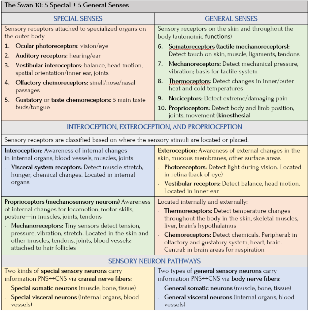 Most current sources are comfortable with eight: the original five external (special) senses of vision, hearing, touch, taste, and smell — and the  three internal (general) vestibular (balance/ equilibrium), interoceptive (pain, pressure, vibration, temperature), and proprioceptive (body awareness, movement) senses. One could live with this, but science is on the move. So I’ve devised the “Swan 10” — a riff on the Durie 10—capturing all body sensations, with differentiated sensory receptors that show up and overlap across the body.